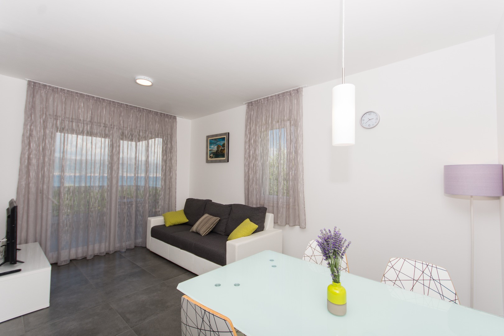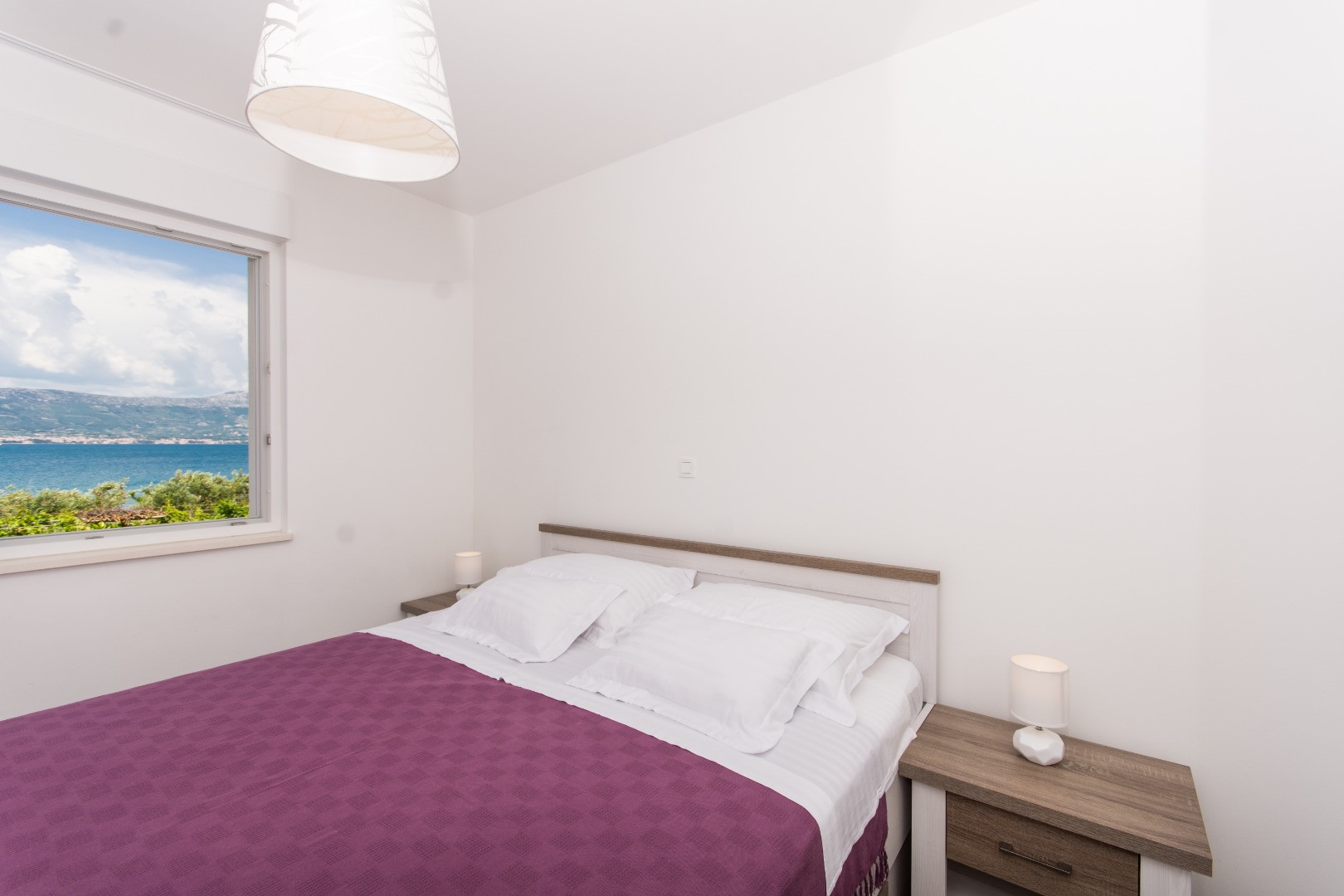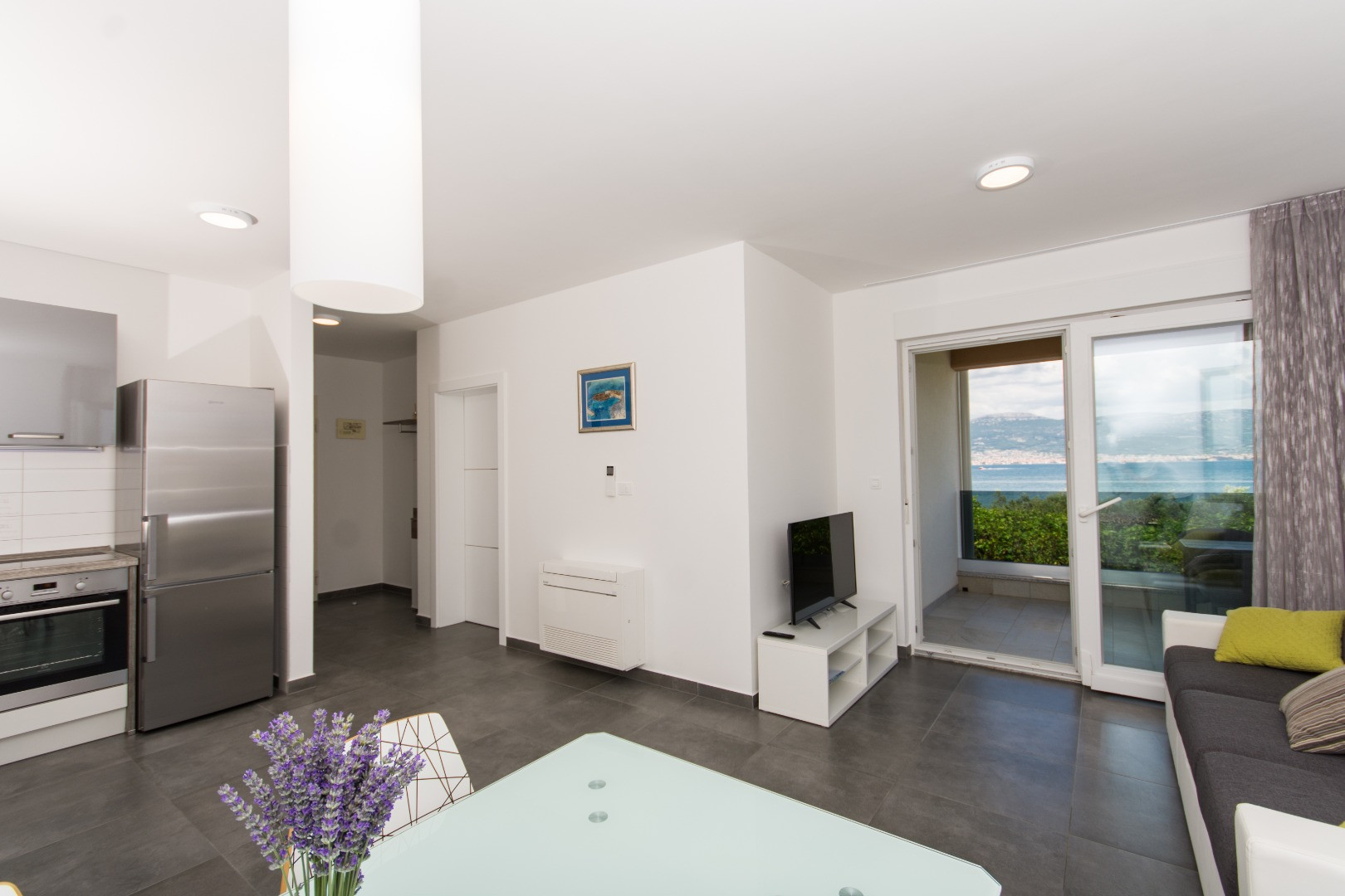 A one-bedroom apartment located on the ground floor on the south side, with a mezzanine on the north side facing the sea and the pool. It consists of one bedroom with an en-suite bathroom and WC; an additional guest WC; a fully equipped kitchen; a living area with a fold-out sofa that provides an extra 140 × 200 cm bed; and a large balcony with an open sea view. The apartment is ideal for a young family with one child or a couple.
