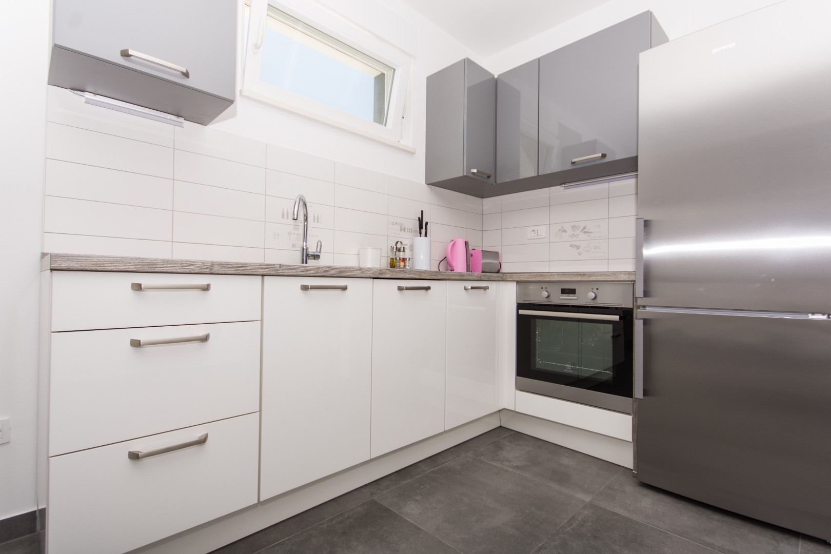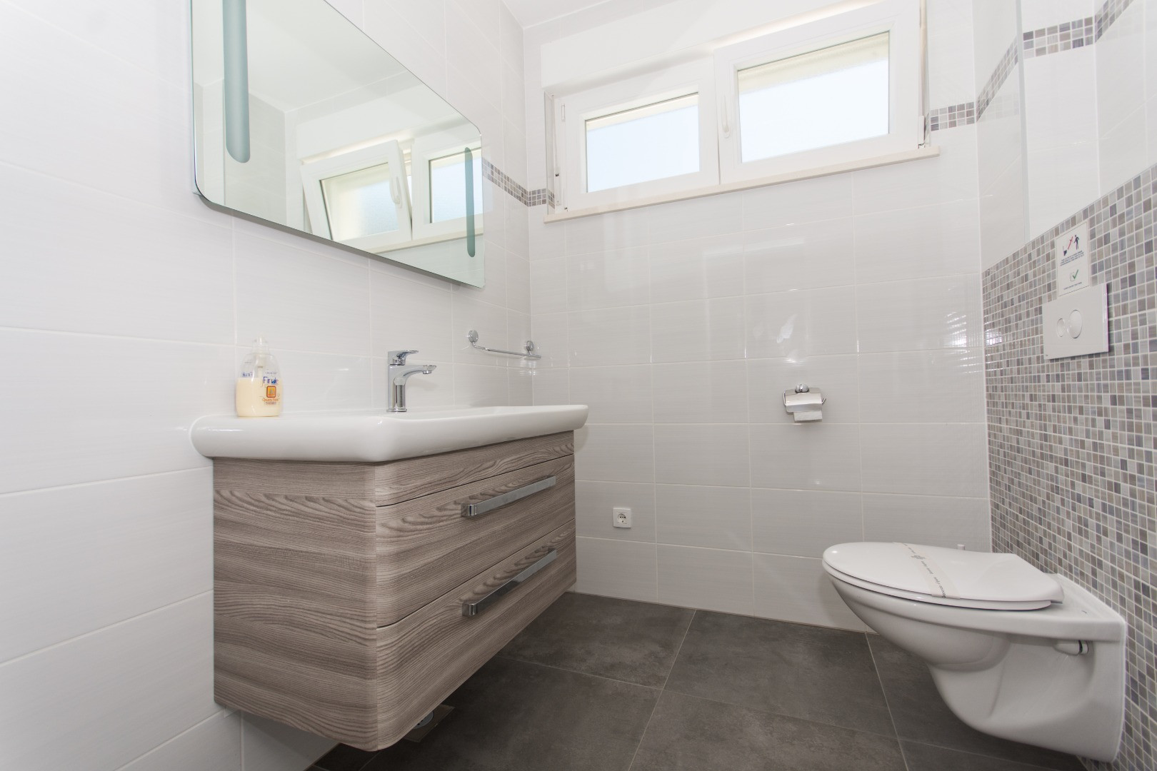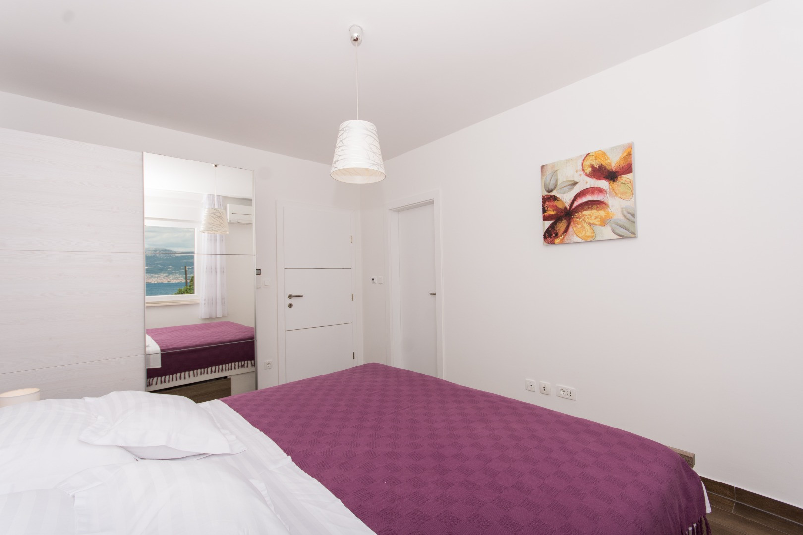A one-bedroom apartment located on the ground floor on the south side, with a mezzanine on the north side facing the sea and the pool. It consists of one bedroom with an en-suite bathroom and WC; an additional guest WC; a fully equipped kitchen; a living area with a fold-out sofa that provides an extra 140 × 200 cm bed; and a large balcony with an open sea view. The apartment is ideal for a young family with one child or a couple.