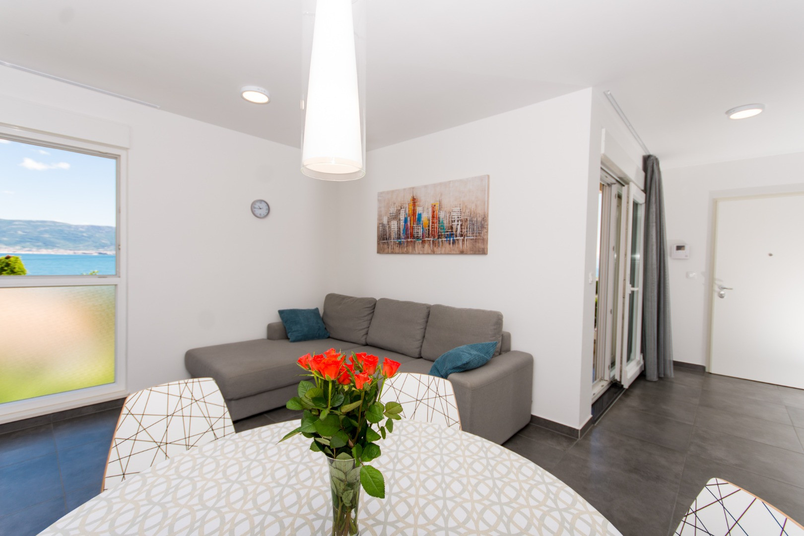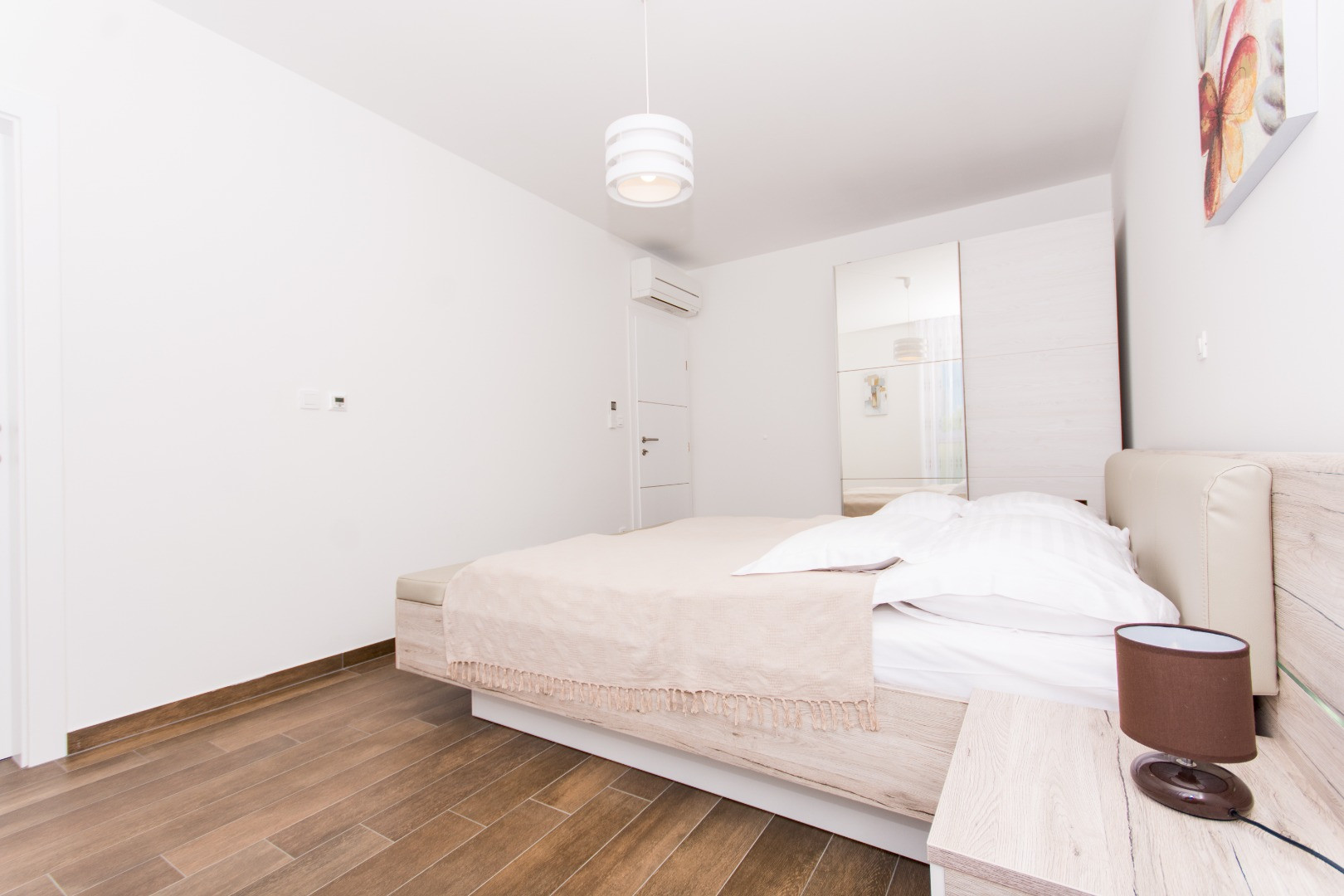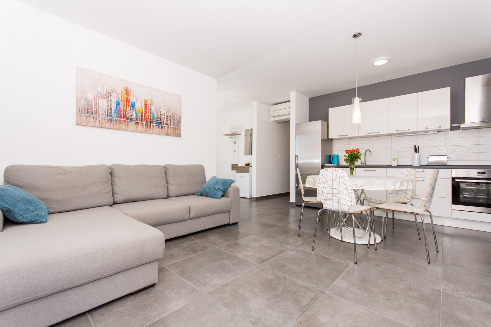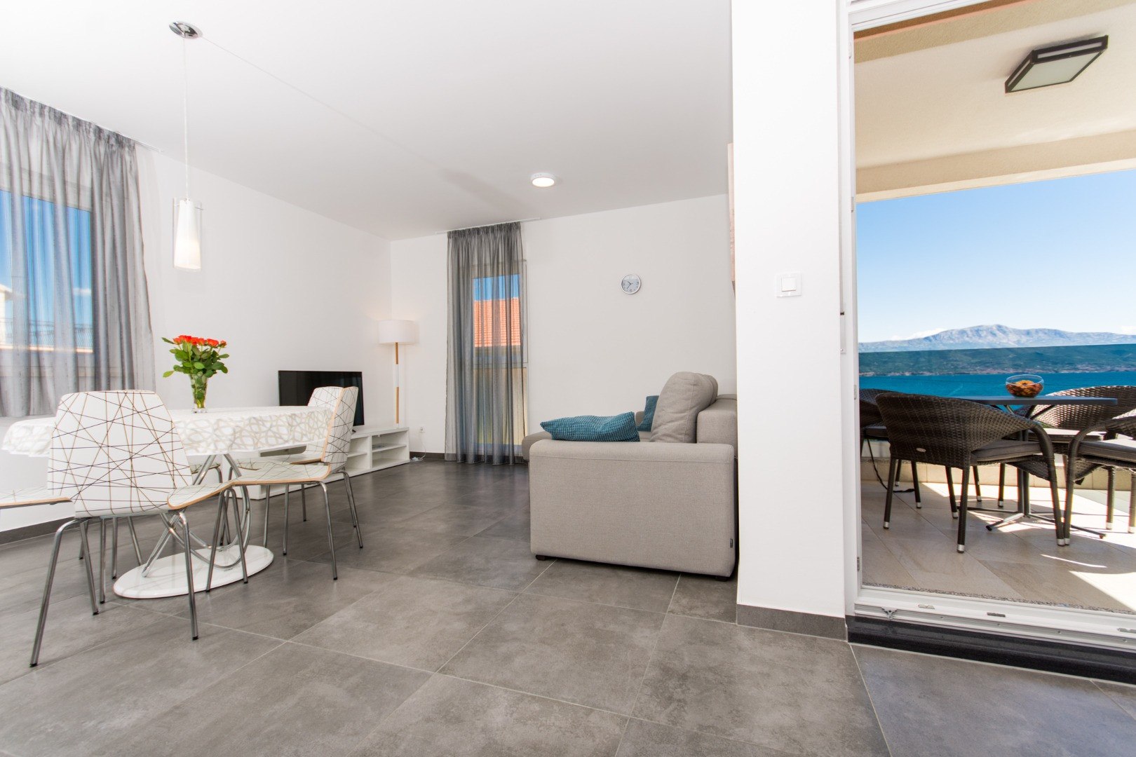 A two-bedroom apartment located on the mezzanine level between the ground and first floor, featuring an open sea view. It consists of two bedrooms with king-size beds (180 × 200 cm), each with an en-suite bathroom and WC; an additional guest WC; a fully equipped kitchen; a living area with a corner sofa set; and a large balcony with an open sea view. The apartment is ideal for a family with two children, two couples, or a group of four. Every room is air-conditioned and has Wi-Fi and SAT TV with free-to-air channels. Car parking is provided in a large on-site parking area within the property.