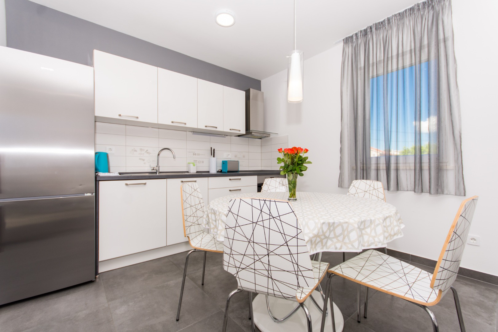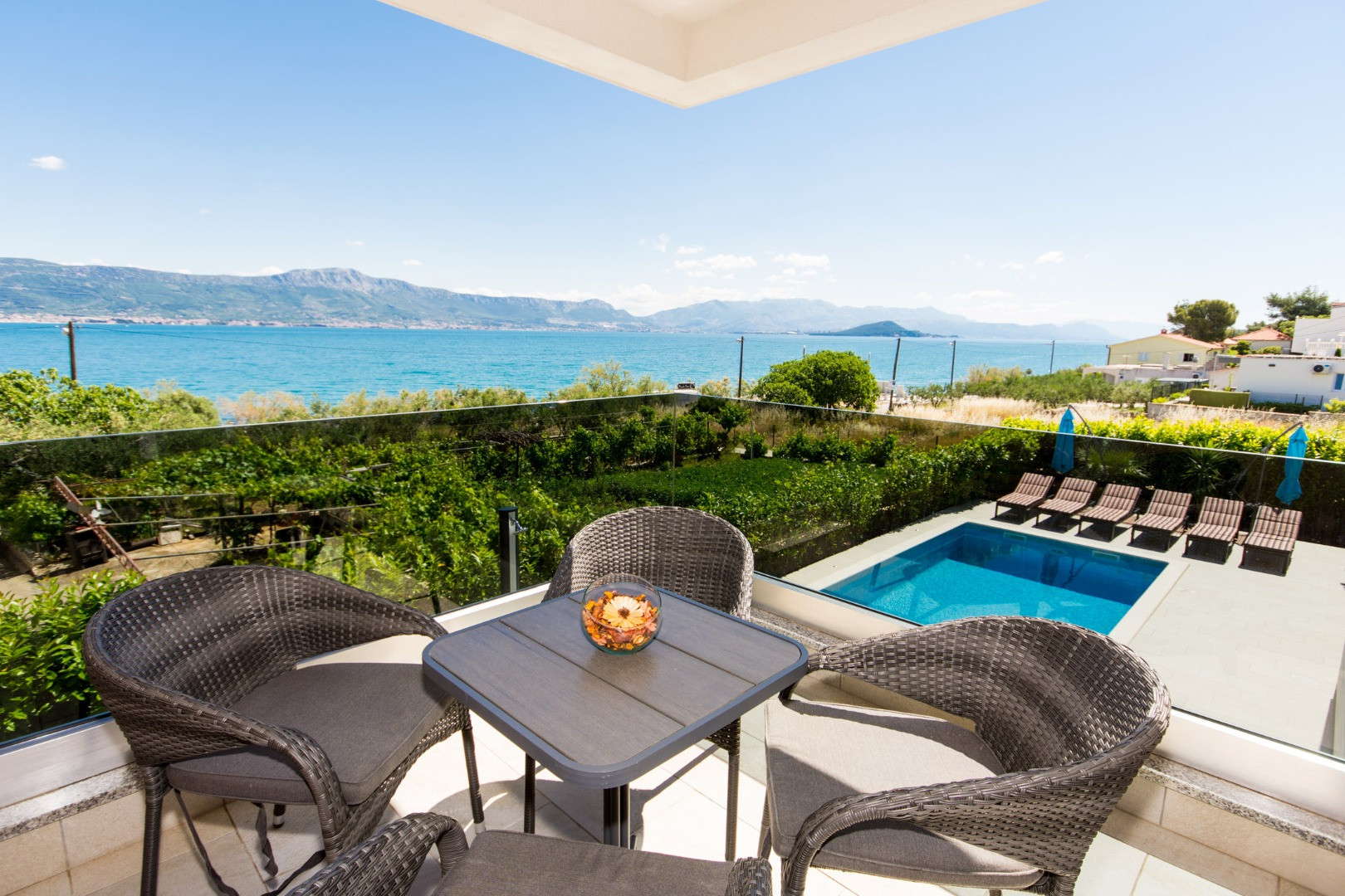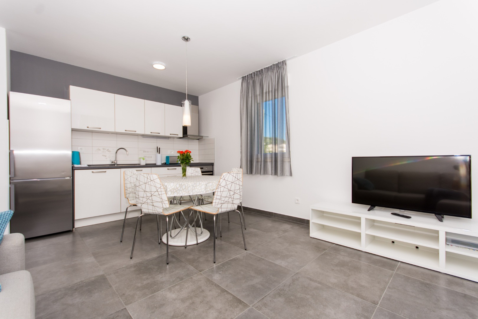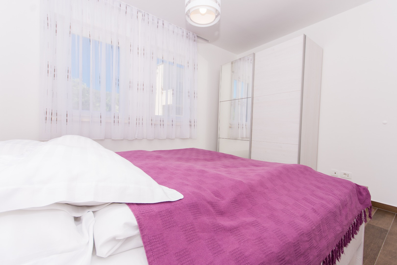 A two-bedroom apartment located on the mezzanine level between the ground and first floor, featuring an open sea view. It consists of two bedrooms with king-size beds (180 × 200 cm), each with an en-suite bathroom and WC; an additional guest WC; a fully equipped kitchen; a living area with a corner sofa set; and a large balcony with an open sea view. The apartment is ideal for a family with two children, two couples, or a group of four. Every room is air-conditioned and has Wi-Fi and SAT TV with free-to-air channels. Car parking is provided in a large on-site parking area within the property.