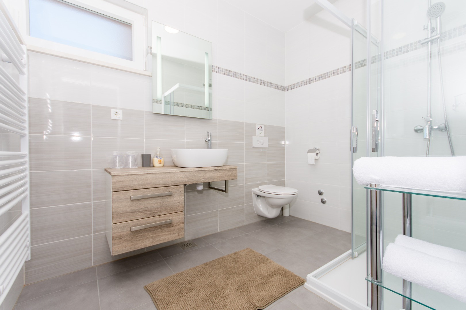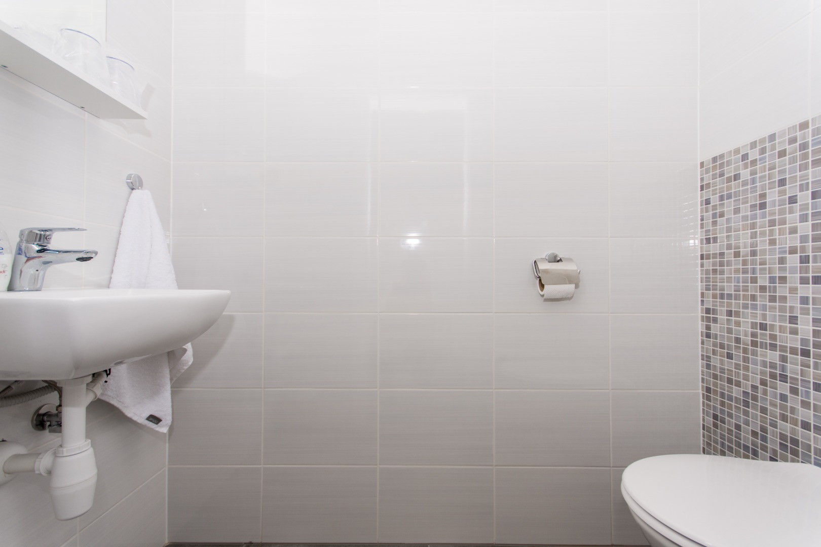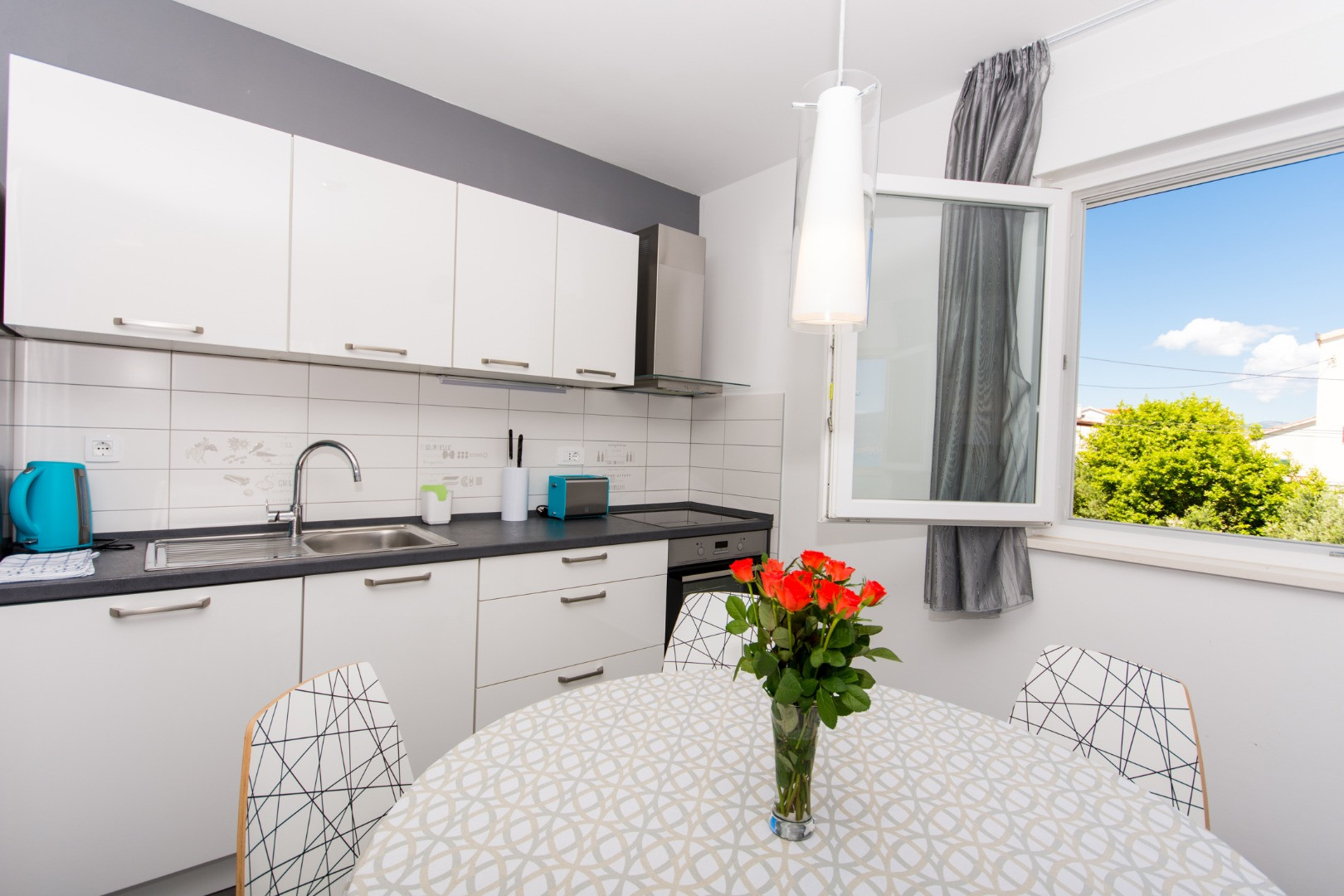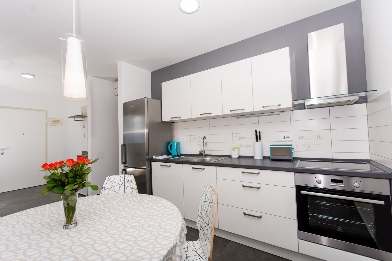 A two-bedroom apartment located on the mezzanine level between the ground and first floor, featuring an open sea view. It consists of two bedrooms with king-size beds (180 × 200 cm), each with an en-suite bathroom and WC; an additional guest WC; a fully equipped kitchen; a living area with a corner sofa set; and a large balcony with an open sea view. The apartment is ideal for a family with two children, two couples, or a group of four. Every room is air-conditioned and has Wi-Fi and SAT TV with free-to-air channels. Car parking is provided in a large on-site parking area within the property.