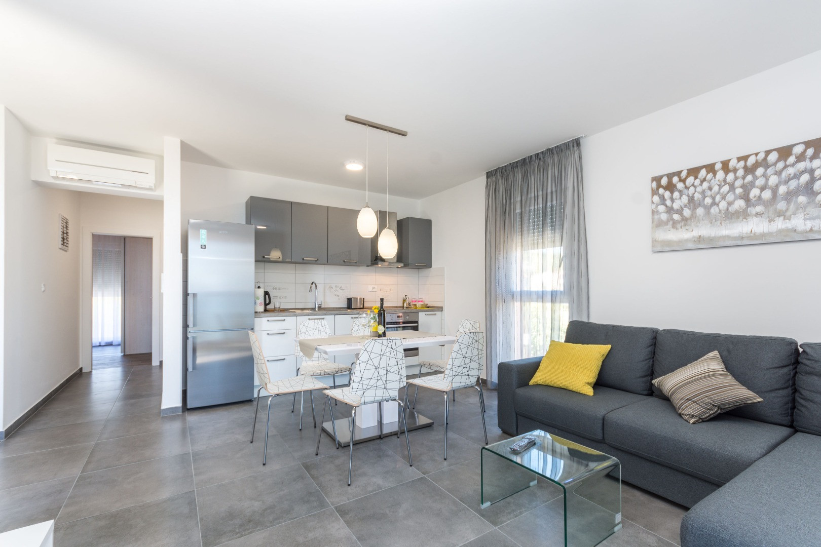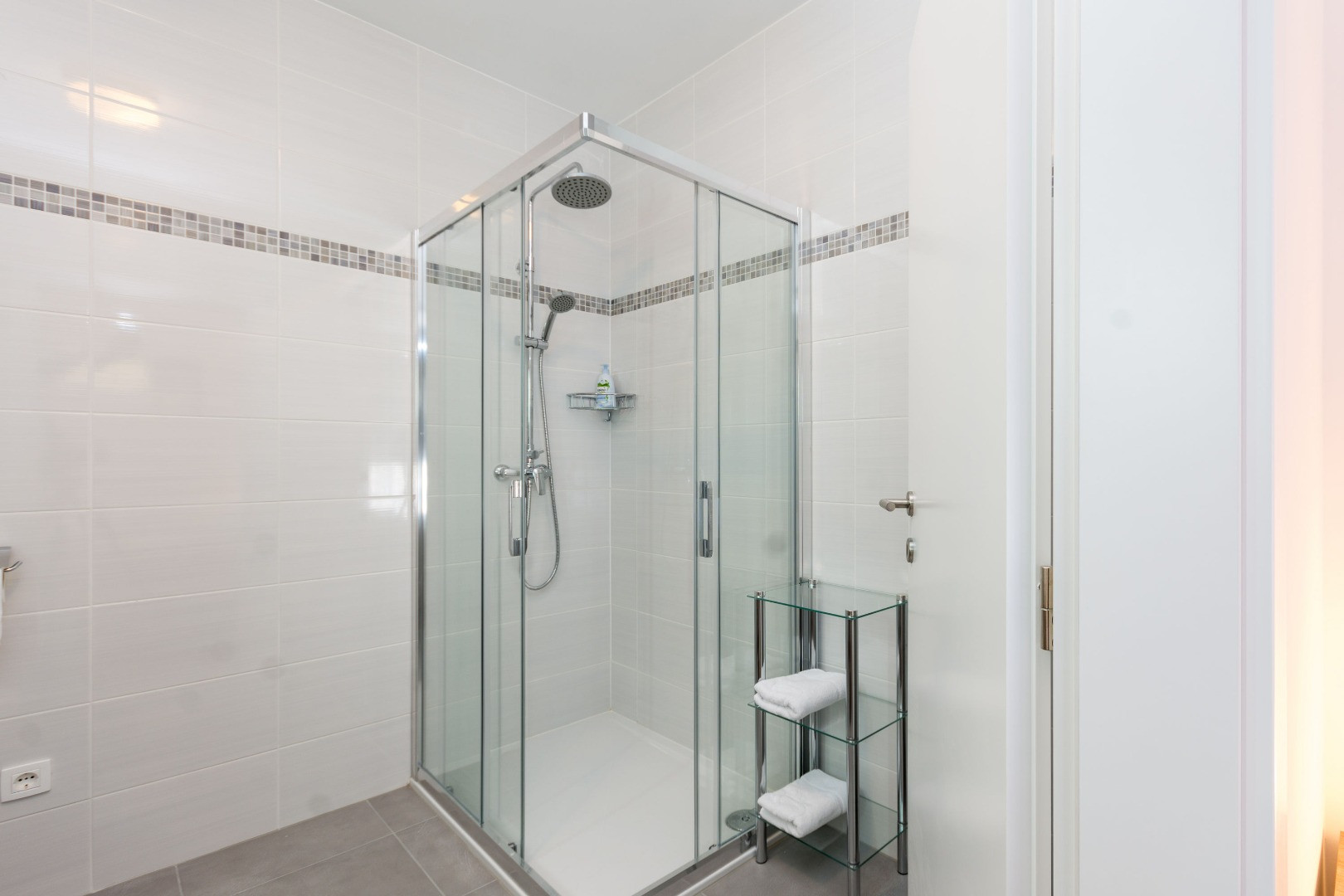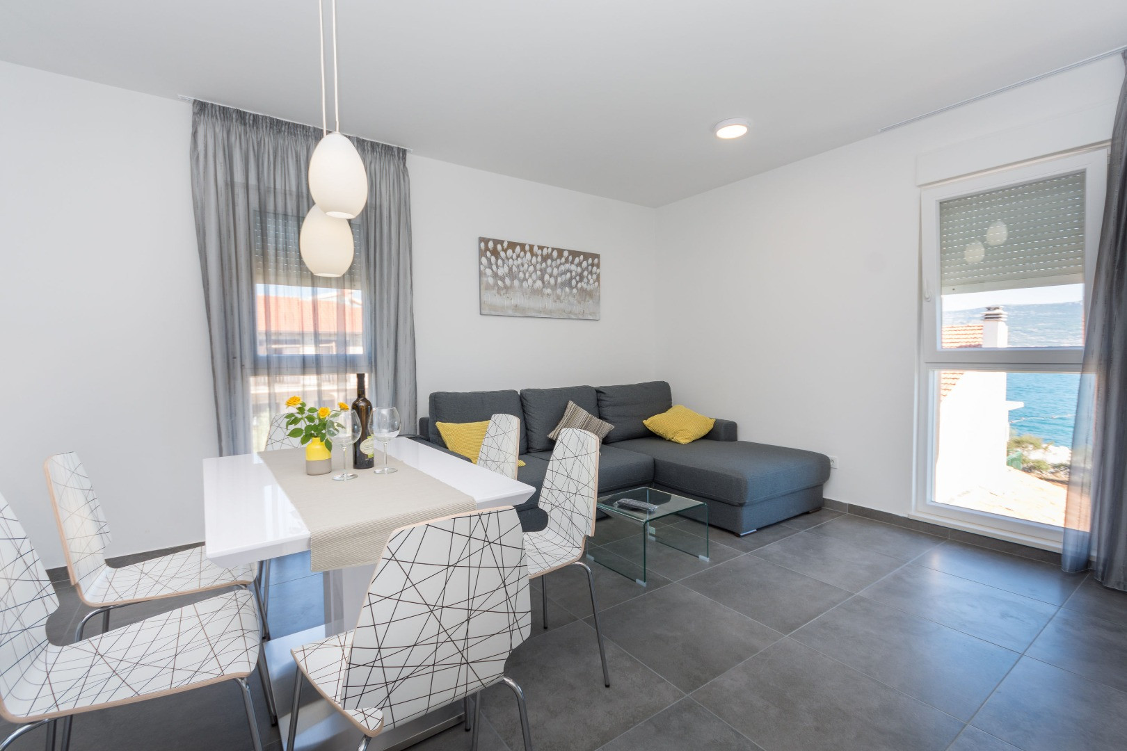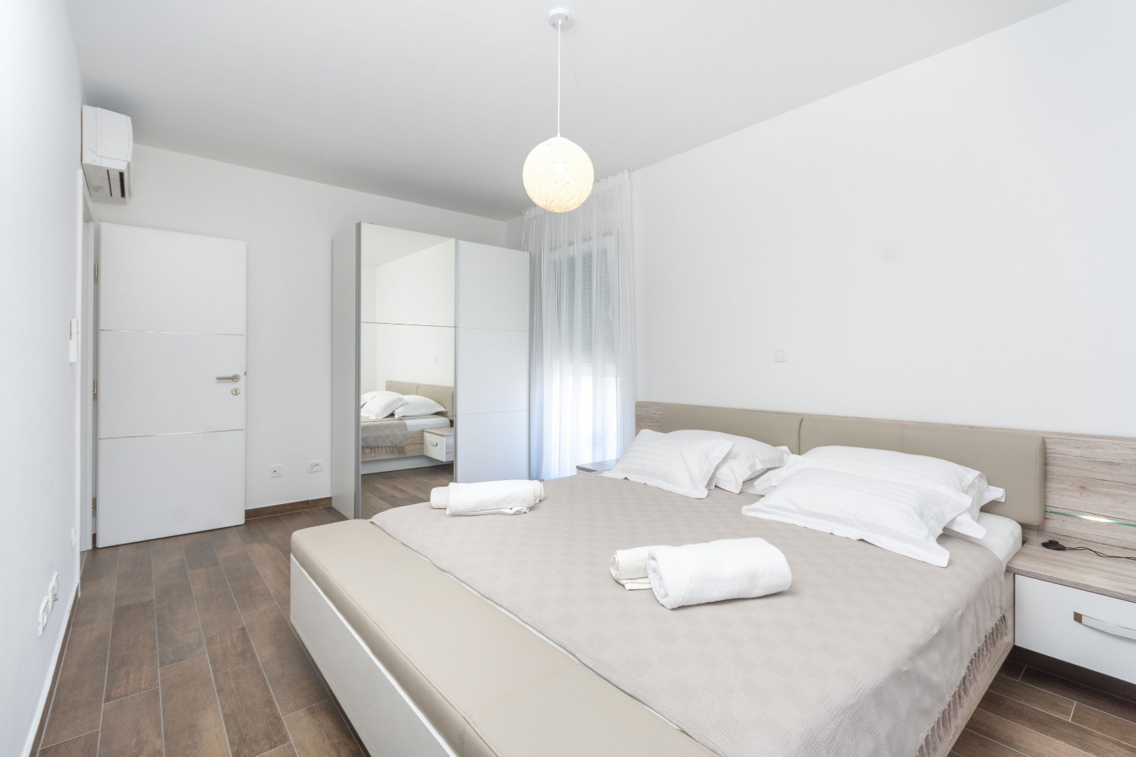 A two-bedroom apartment on the second floor with an open sea view (penthouse). It features two bedrooms with king-size beds (180 × 200 cm), each with an en-suite bathroom and WC; an additional guest WC; a fully equipped kitchen; a living area with a corner sofa set; and a large balcony with an open sea view. There is also a spacious 54 m² rooftop terrace covered by a pergola, with seating and sun loungers. From the terrace, you can enjoy a beautiful open view of the entire Kaštela Bay.