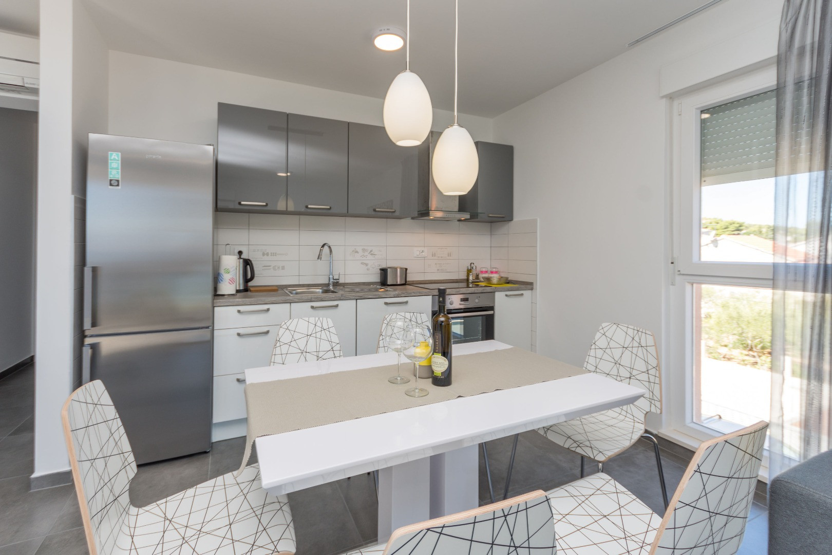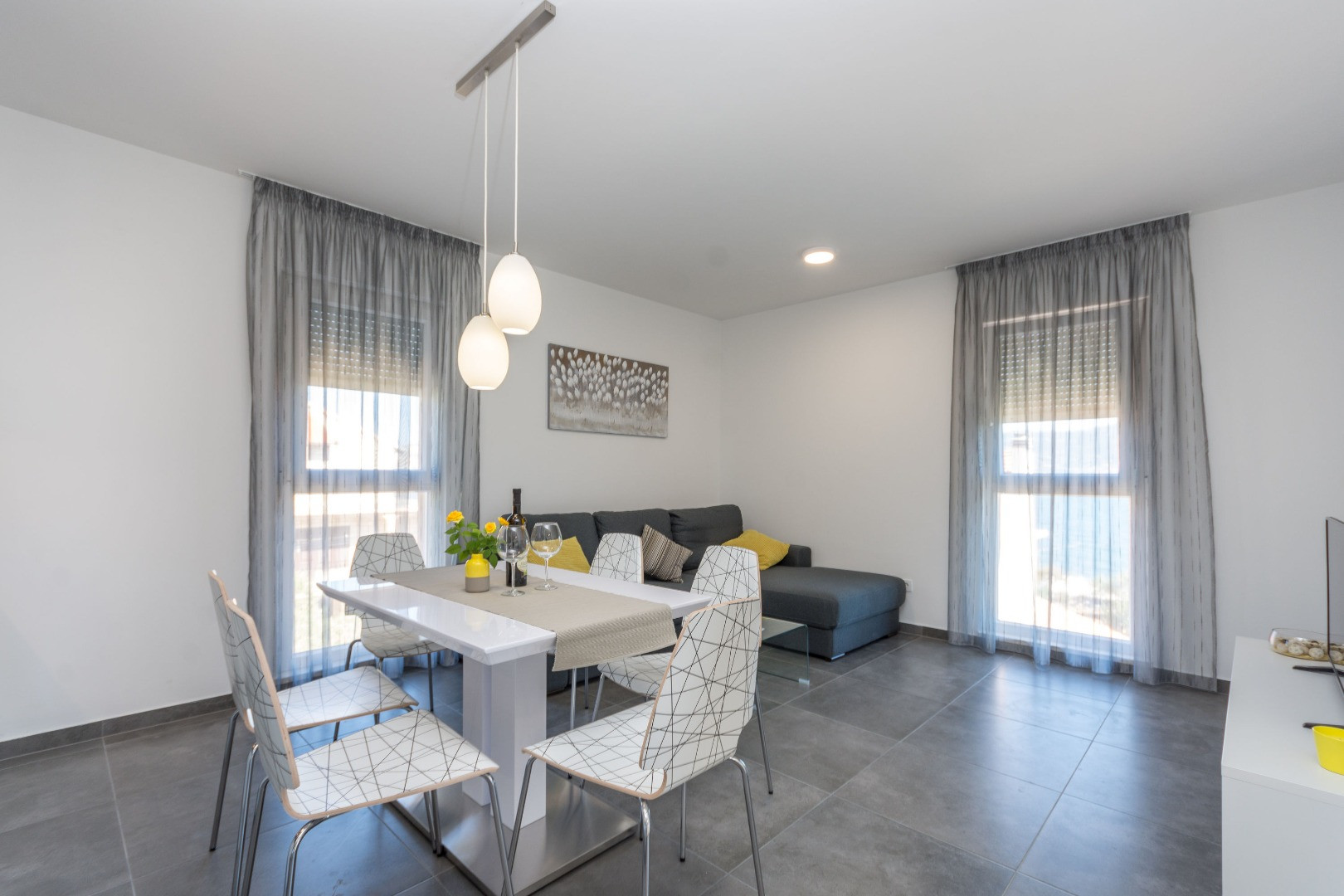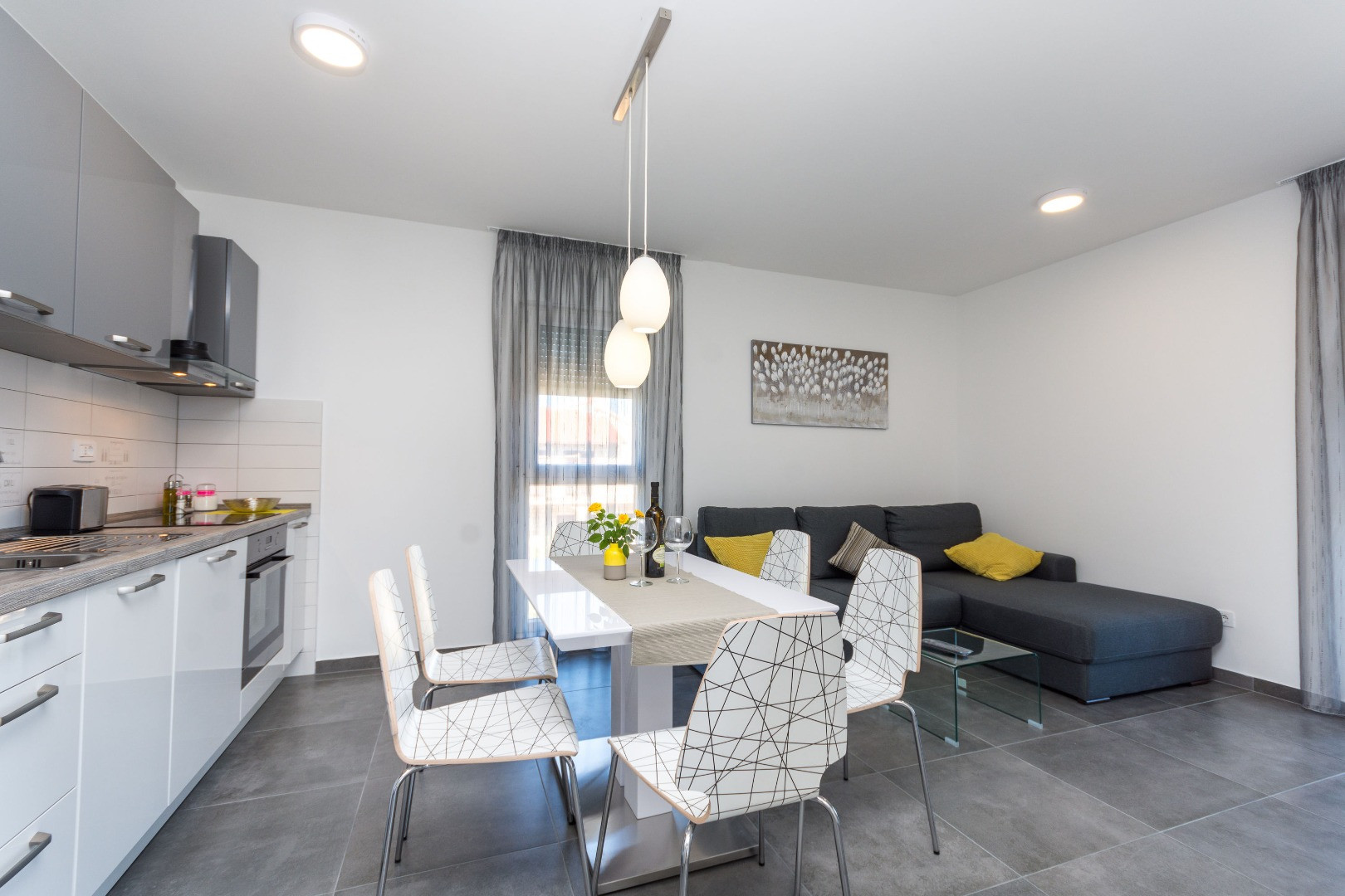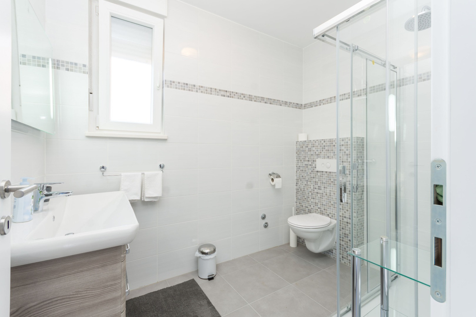 A two-bedroom apartment on the second floor with an open sea view (penthouse). It features two bedrooms with king-size beds (180 × 200 cm), each with an en-suite bathroom and WC; an additional guest WC; a fully equipped kitchen; a living area with a corner sofa set; and a large balcony with an open sea view. There is also a spacious 54 m² rooftop terrace covered by a pergola, with seating and sun loungers. From the terrace, you can enjoy a beautiful open view of the entire Kaštela Bay.