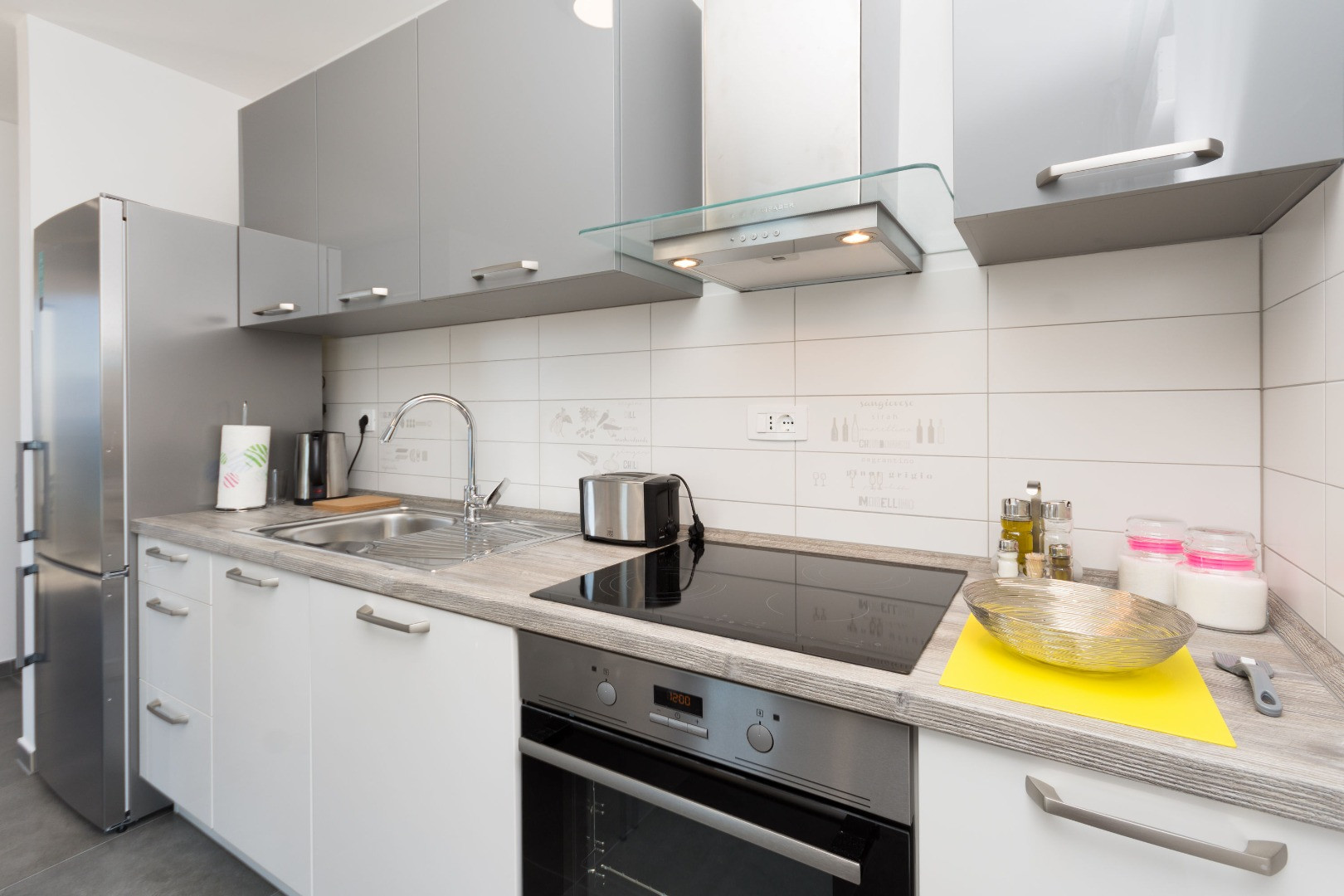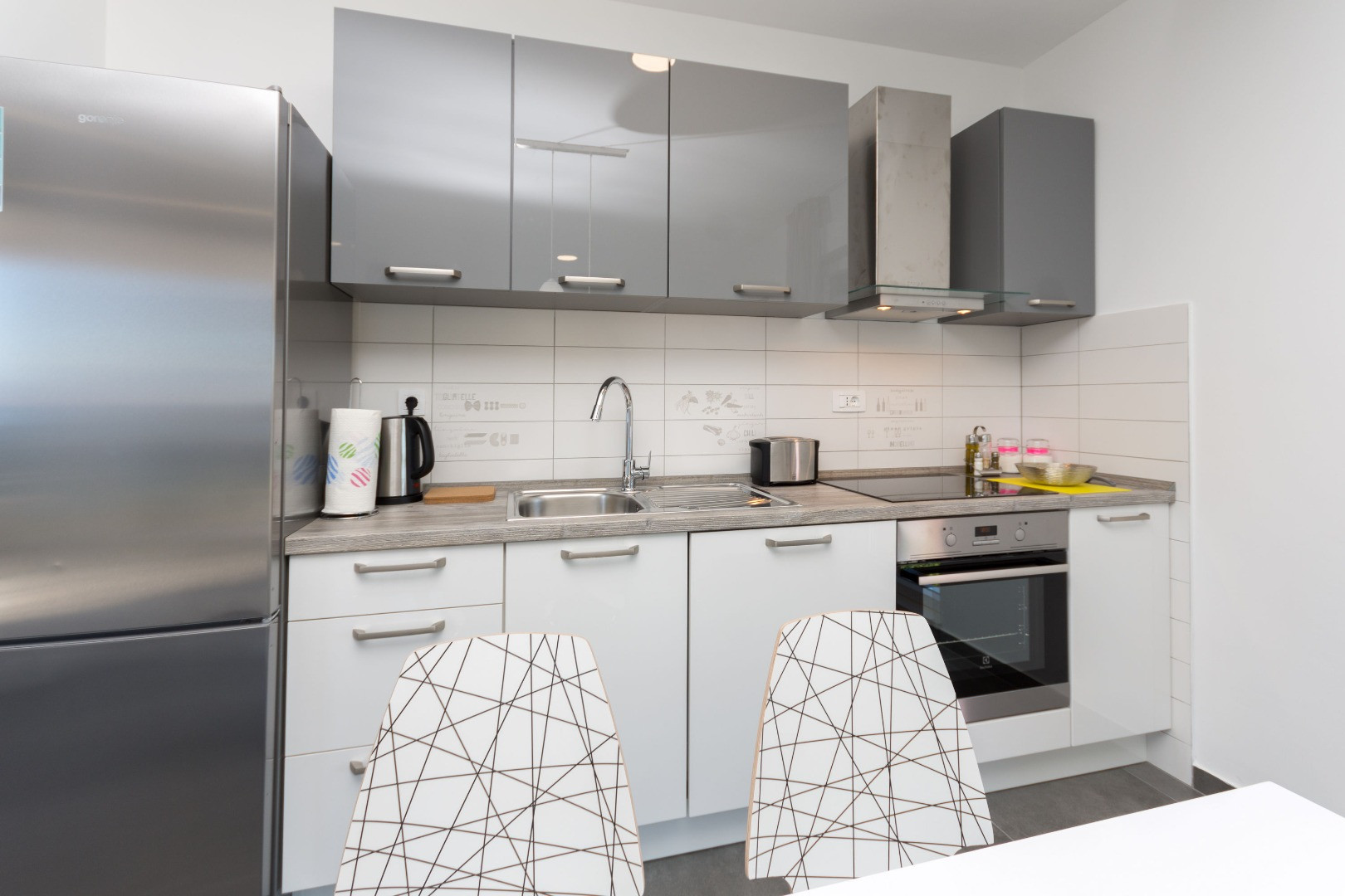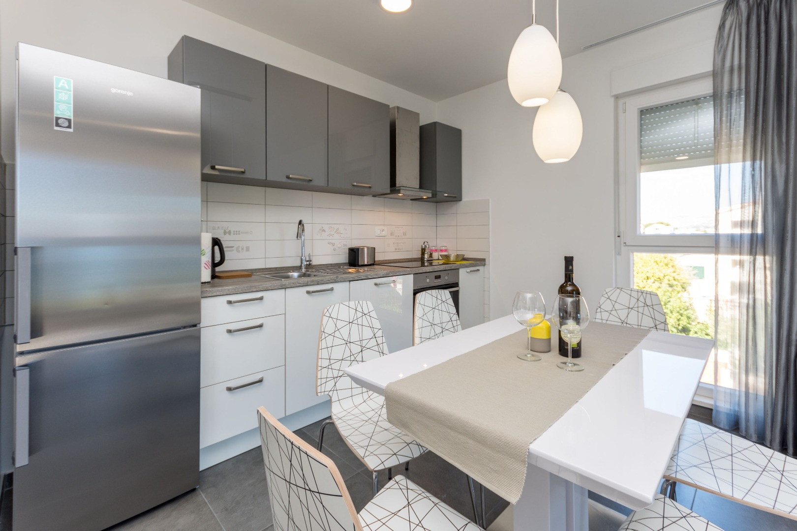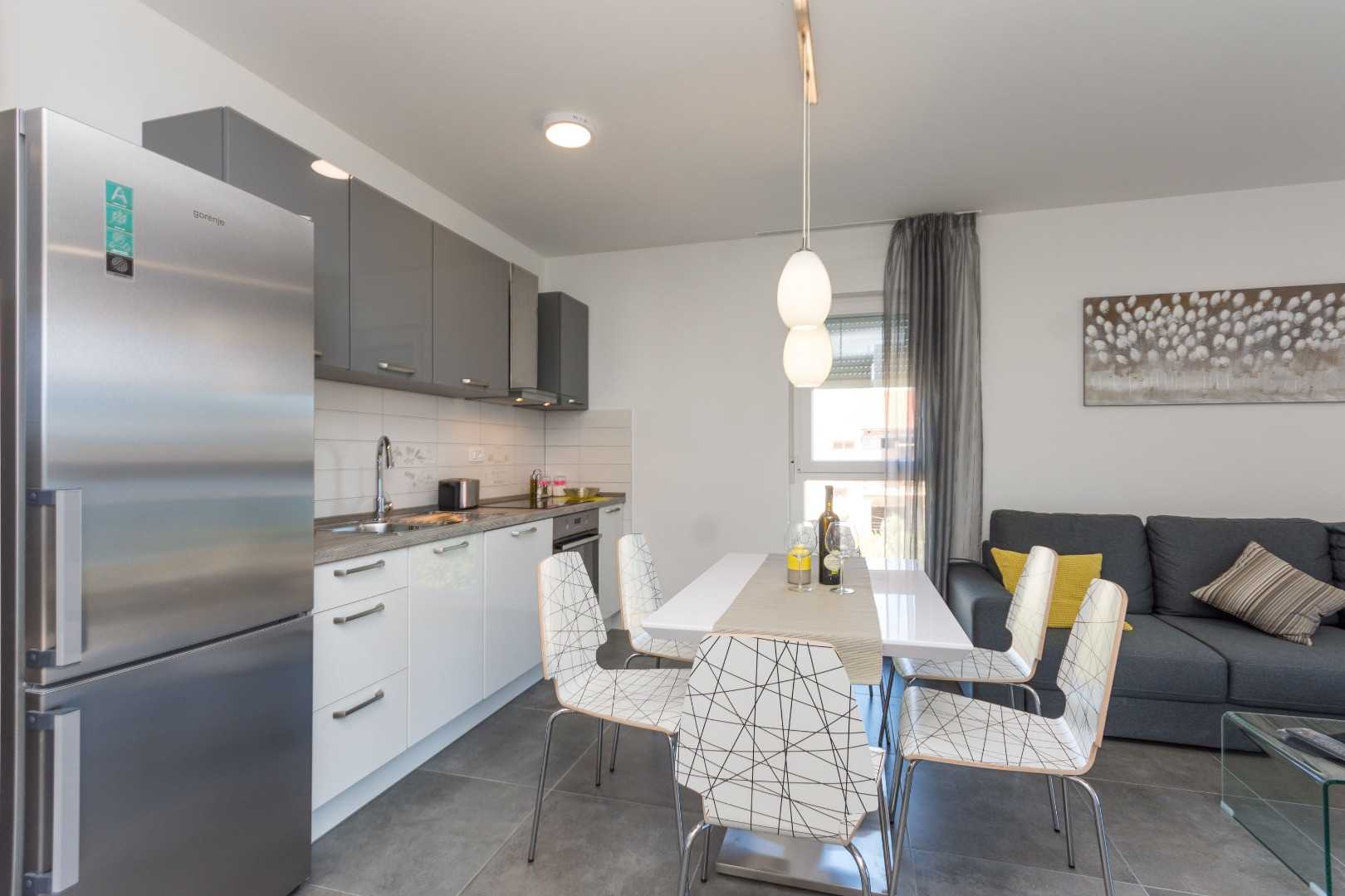 A two-bedroom apartment on the second floor with an open sea view (penthouse). It features two bedrooms with king-size beds (180 × 200 cm), each with an en-suite bathroom and WC; an additional guest WC; a fully equipped kitchen; a living area with a corner sofa set; and a large balcony with an open sea view. There is also a spacious 54 m² rooftop terrace covered by a pergola, with seating and sun loungers. From the terrace, you can enjoy a beautiful open view of the entire Kaštela Bay.